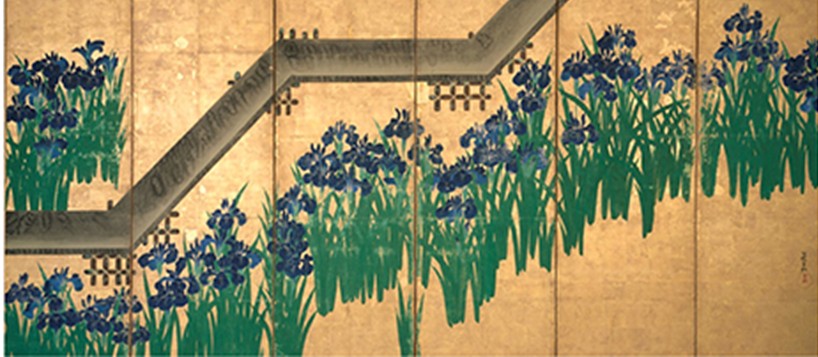Motiven i målningarna kommer från Yatsubashi, åtta broar med irisblommor,  och målningen Irisar på skärmar  från berättelsen Tale of Ise. Där beskrivs en man på resa som kommer till broarna där irisblommor växte och han ombads att skriva poesi om dem. I den första målningen visas bara iris och broarna. I den andra målningen har konstnären reducerat motivet än mer och där visas bara irisblommor. Dessa verk kunde innehålla hela naturscener med jord, berg i bakgrunden, himmel med moln och huvudrollspersonerna, men allt detta har medvetet inte tagits med. Till och med broarna är inte med på andra målningen, bara irisblommor, det visas inte ens var dessa växer, i jord, nära floden eller i vatten. Ändå vet de flesta japaner som betraktar verket vad de ser och upplever, de som känner till Tale of Ise kommer veta när de bara ser irisar att det är berättelsen om mannen på vandring, om broarna och att mannen skriver poesi om där iris växer.