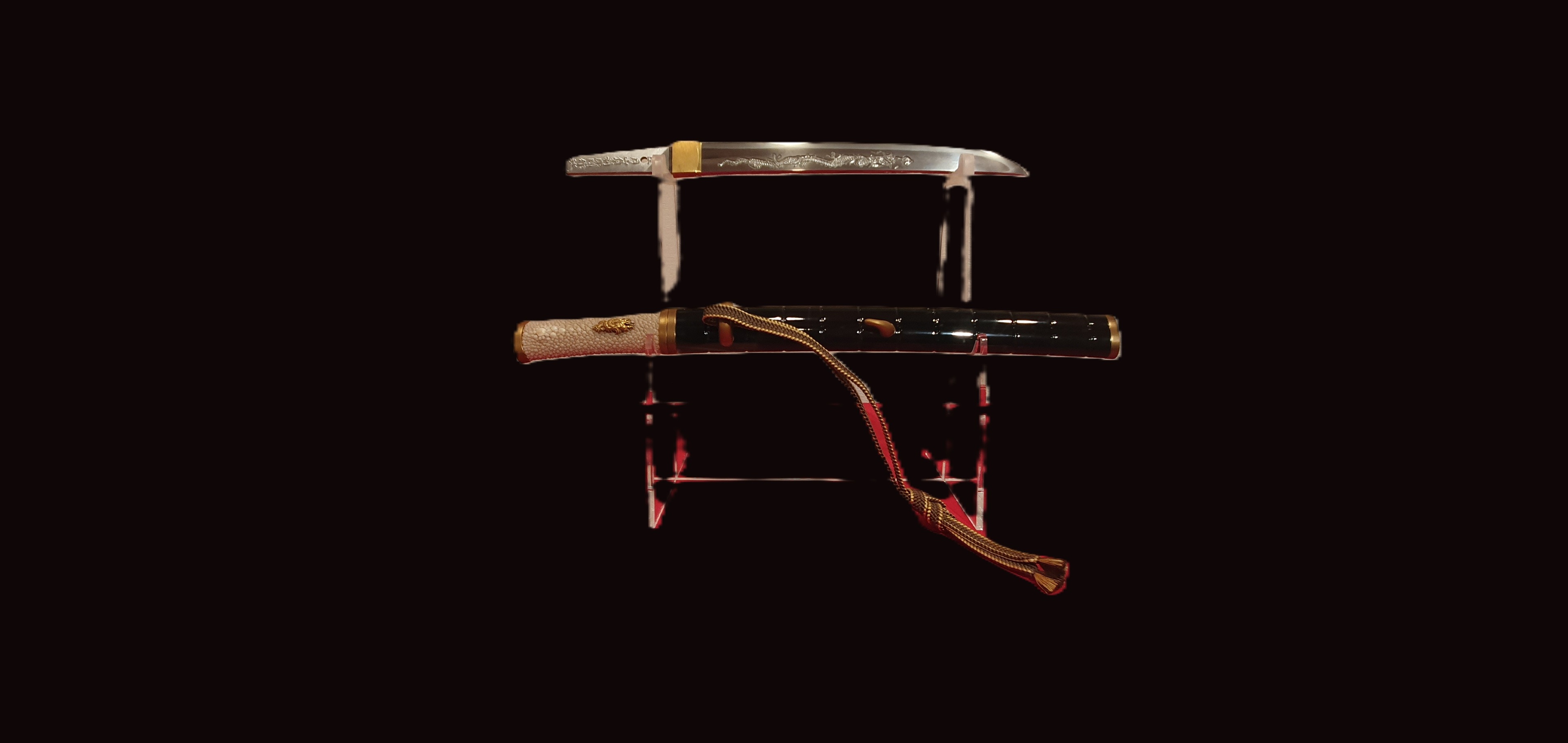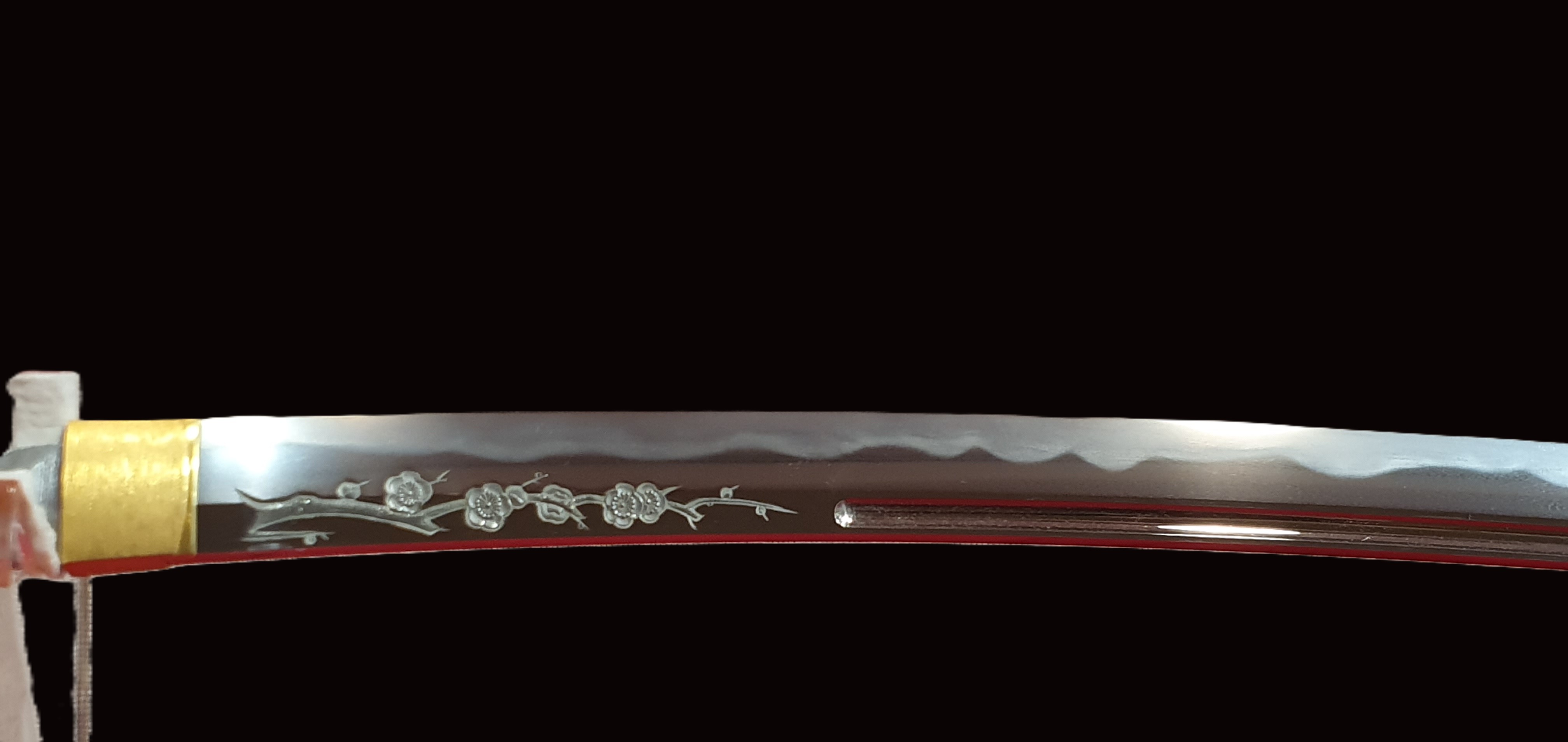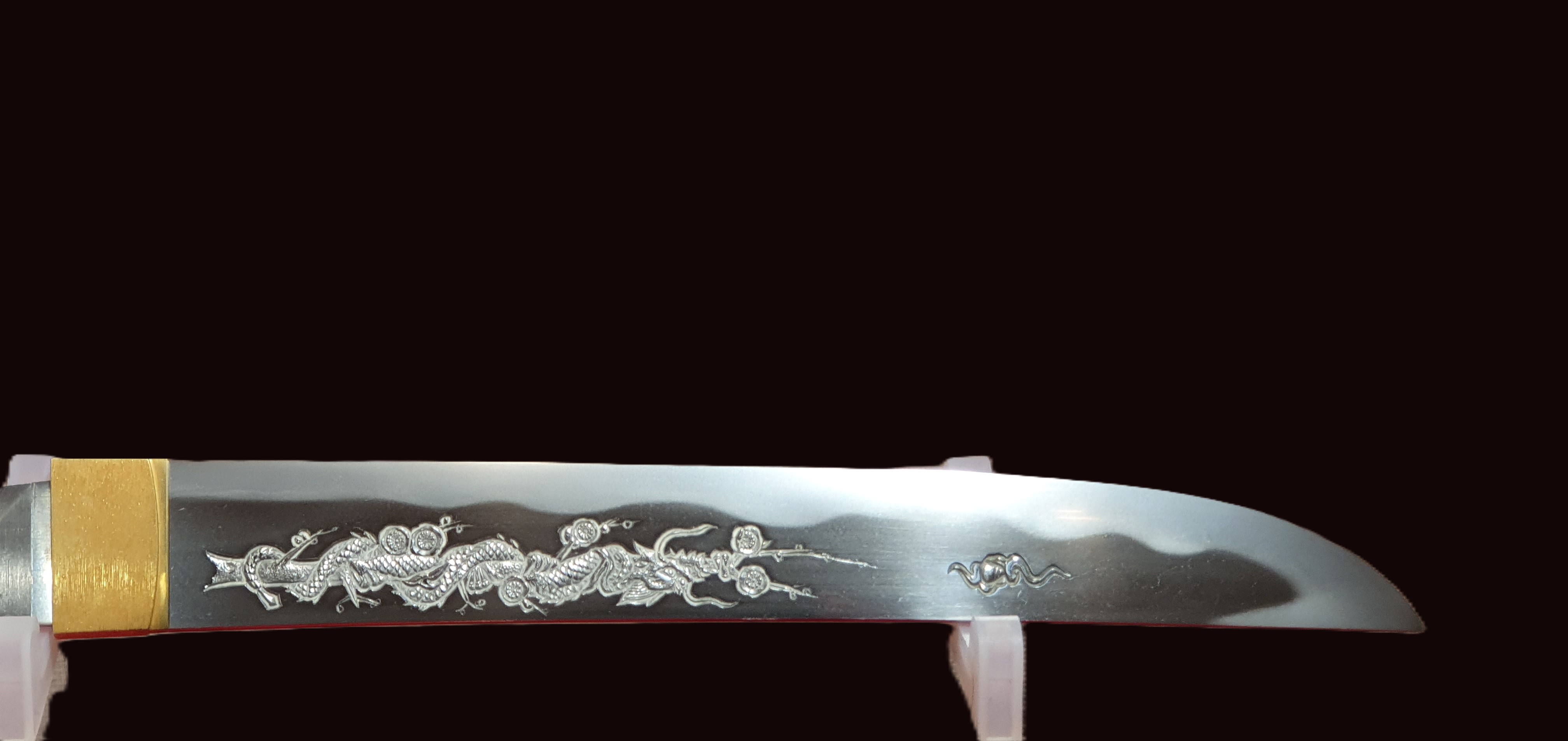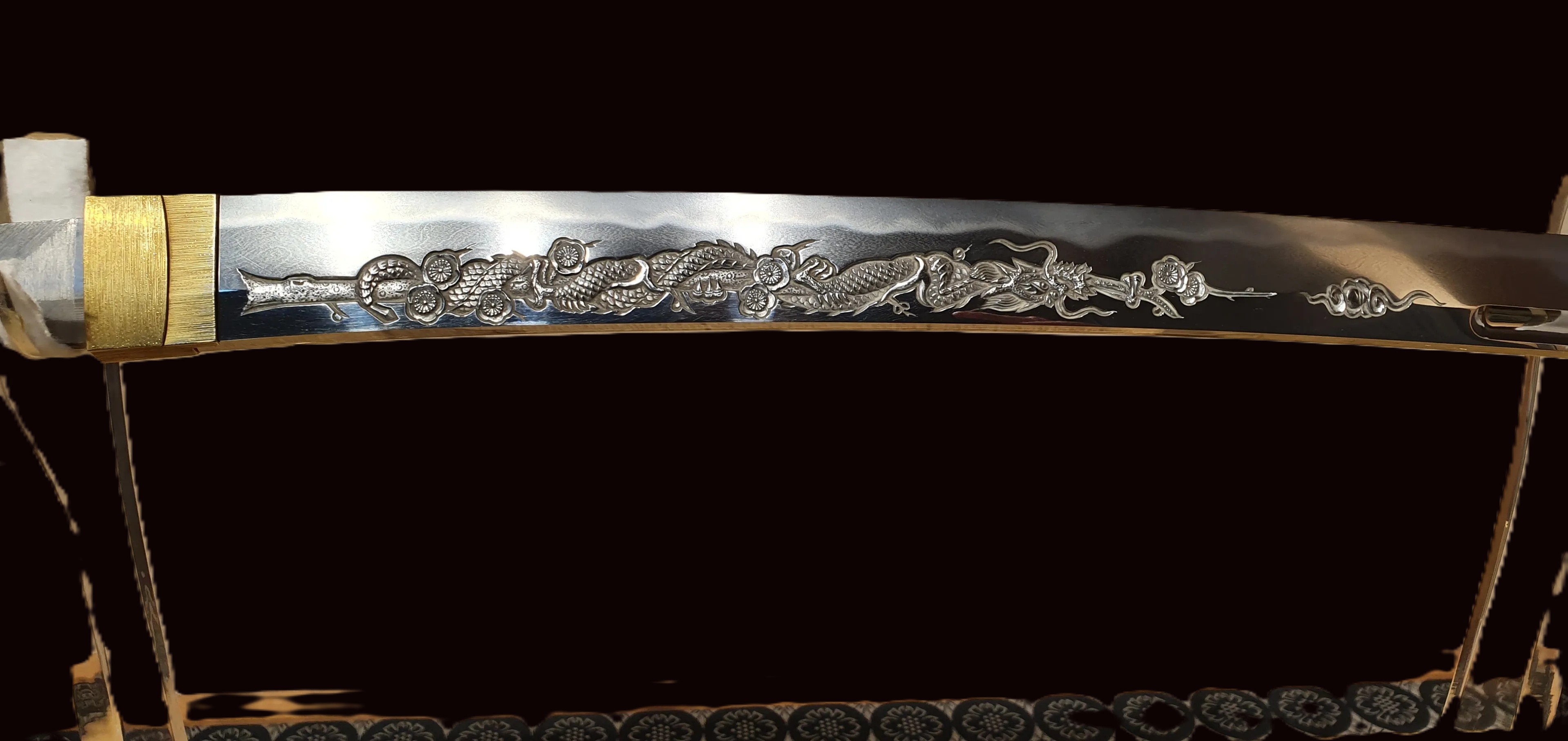 Svärdet nedan är  nytillverkat stålsvärd av tamahagane av mästersmeden Gassan Sadatoshi.  Motiv i gravyren en drake som slingrar sig runt ett plommonträd.